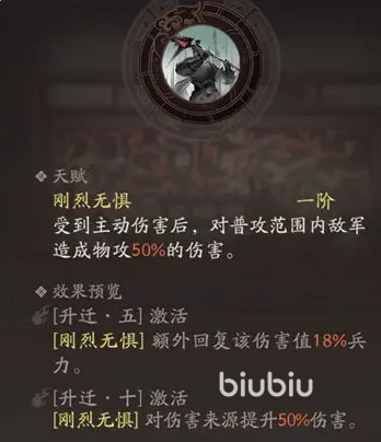 在天赋进阶方面,推荐优先选择“刚烈无惧”,这是夏侯惇的核心天赋之一。但需要注意的是,不应拘泥于不升星的传统思路,而应根据实际阵容需求灵活调整强化等级。若构建的是防守反击型队伍,建议优先达到5星,以激活生命回复效果。18%的伤害转化回血能显著增强持续作战能力,结合高额物理防御属性,可稳固承担前排承伤职责,并频繁触发反击机制。而对于爆发输出类阵容,则应冲刺10星,获得50%的伤害加成,配合单体高伤技能,可在受到攻击后实现强力反制,有效对抗高攻型武将。