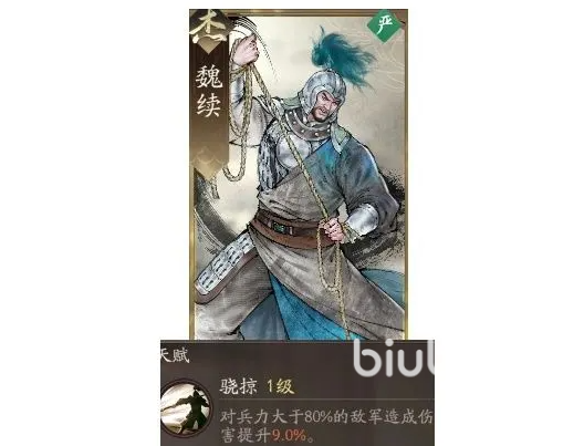 魏续的核心优势在于低养成成本与高实战表现的结合。其自带的“骁掠”天赋可在面对兵力较高的敌军时提供9%的伤害加成,这一特性使其在对抗高血量目标时具备显著输出提升。若将其与曹操搭配,再辅以宋宪,即可构建出一套攻守兼备、节奏流畅的平民战阵。该阵容的核心思路为:前排承伤兼主输出、辅助增益赋能、副C灵活补伤与收割。
