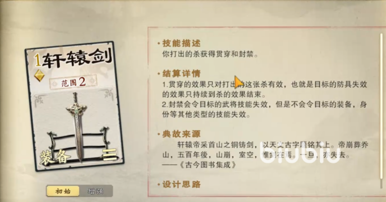 装备轩辕剑后,使用者每次使用【杀】时,该【杀】具备贯穿与封禁双重效果。其中,贯穿可无视目标防具,而封禁则限制被指定角色在本回合内无法发动武将技。
