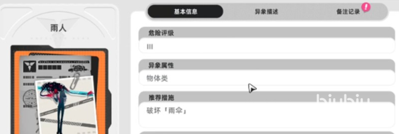 雨人是一种擅长伪装的威胁单位,常态下形似普通雨伞,静止于街角或屋檐下。当玩家靠近时,若环境未下雨,它将突然发起突袭。唯有将其本体彻底摧毁,才能完成有效清除。因其隐蔽性强,常造成意外伤害,建议在探索时对可疑物品保持距离。