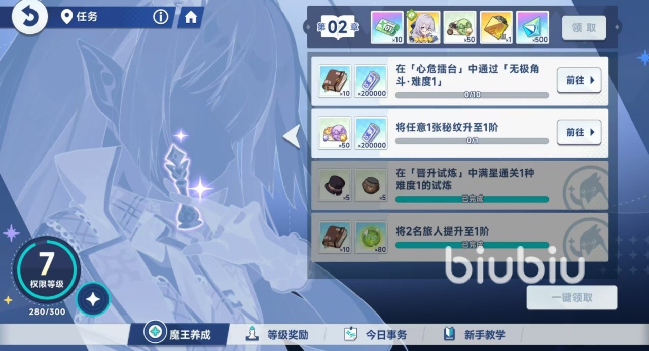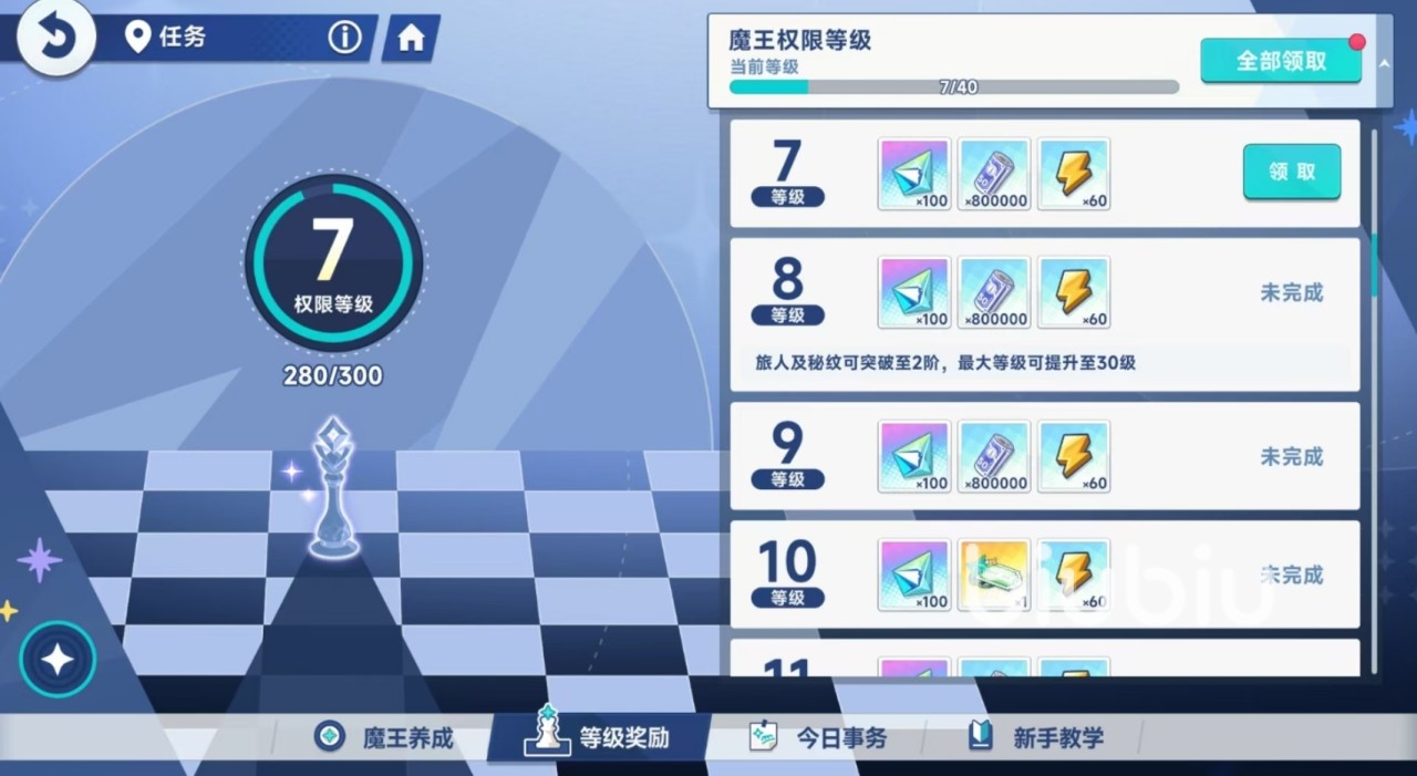 第三种方式是在“魔王养成”界面推进章节任务,该系统设有多个章节的任务链,涵盖非战斗与低难度战斗目标,完成门槛较低。每一章全部完成后不仅能获得大量权限经验,还可领取包含星之砂、体力药在内的高价值奖励,回报率极高,建议优先推进。此外,每当权限等级成功提升后,记得前往等级奖励页面领取对应阶段的奖励物品,避免资源遗漏。