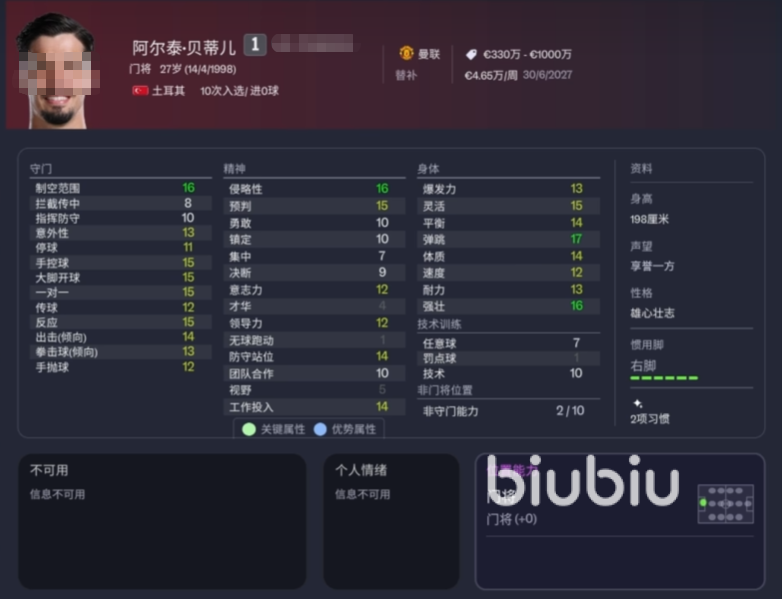 阿尔泰·贝蒂儿:打门将位置,制空范围在16点,控制力强,另外身体素质也优秀,弹跳能力为17,搭配16点的强壮属性,防守效果不错。