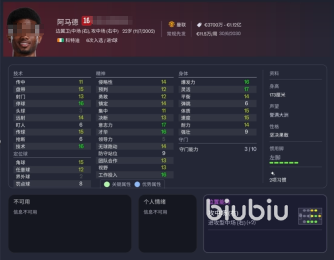 阿马德:常规先发的年轻球员,打边翼中场位置,停球能力强,技术力也有16点,另外身体素质佳,精神力在新一代球员当中属性也不错。