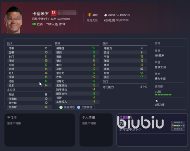 卡塞米罗:常规先发打后腰中场位置,进球能力强,头球属性跟抢断能力都高达17点。作为成熟的老球员,精神属性都很高,身体素质也不错。