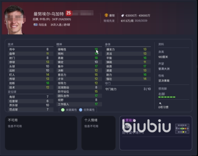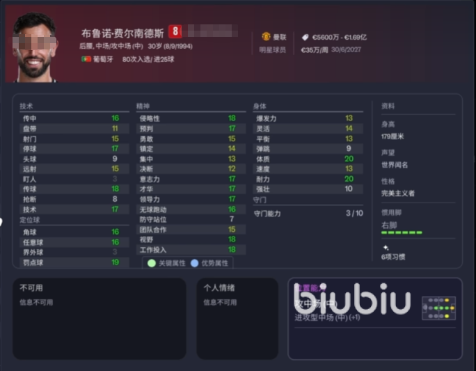布鲁诺·费尔南德斯:曼联明星球员,主打后腰位置,可以看到各项属性都极高,综合潜力能超过170,年过30依旧身体素质强劲,耐力更是高达20。