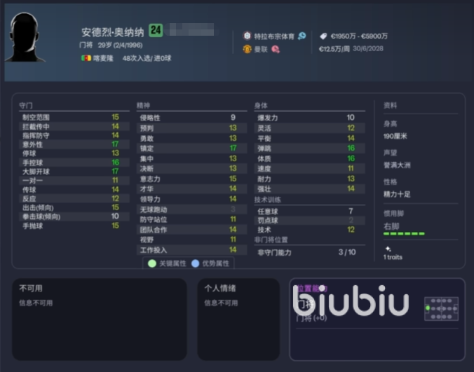 安德烈·奥纳纳:另一位可用门将,本版本当中稍有削弱,然后技术力不错,意外性达到17点,还拥有16点手控球以及17点大脚开球能力,在场上是一名不错的反击型守门员。