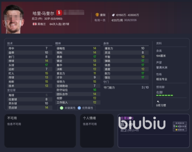 哈里·马奎尔:后卫选手,头球能力17,另外勇敢17,身体素质多项指标都有17,是一名强壮的有进攻风格的球员。