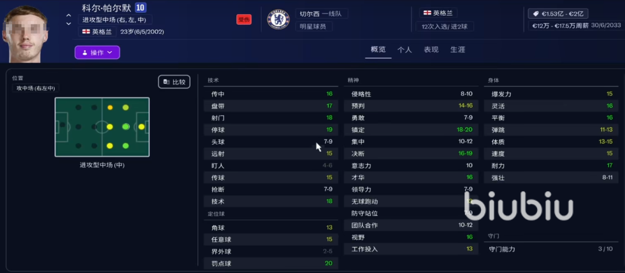 9、科尔·帕尔默:进攻性中场选手,技术数值偏高,其中射门以及技术力有18点,停球为19点,而罚点球更是高达20点。精神力数值不错,镇定跟决断属性高,超过16点,另外身体素质普遍在15点左右,综合属性不错的一位球员。