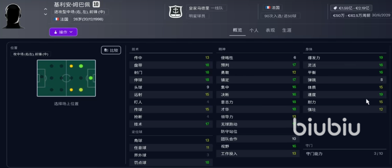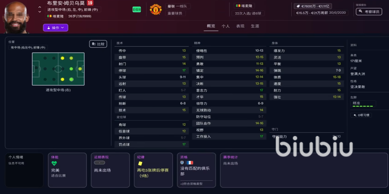 1、布里安·姆贝乌莫:曼联一线球员,技术力当中停球属性高,数值17点十分优秀,同样强力的还有罚点球能力,精神方面普遍在15点左右,属于综合能力强的球员。