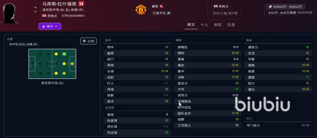 2、马库斯·拉什福德:本版本当中稍微有些削弱,但是整体属性也不错,罚点球能力达到16,其他技术力也在13-15点范围中,精神力当中才华以及无球跑动属性高,身体素质也普遍在15点左右,尤其爆发力跟速度分别达到了16跟17点,还是不错的。