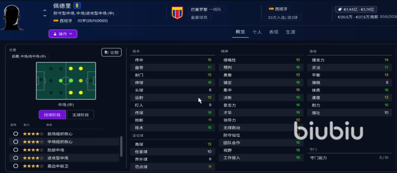 4、佩德里,优秀的防守型中场球员,技术力当中盘带能力强,达到17点,另外停球,传球还有技术数值,都有18点,精神方面预判,镇定,决断等数值都很高,大量属性在16点以上。