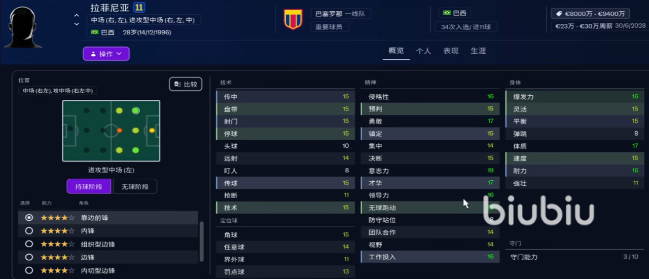 3、拉菲尼亚:中场球员,技术娴熟,基础数值都在15点左右,较为均衡,赛场表现无论是靠边前锋,内锋,组织型边锋等表现都不错。个人情绪佳,精神力数值普遍偏高,尤其是无球跑动能力可达到19点,身体素质也有很多分布在16、17点左右,综合评分高。