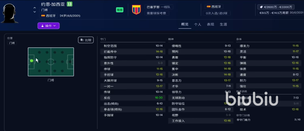 6、约恩·加西亚:优秀的门将,拦截传中能力范围在14-18点,而反应力为16-20点,属性极高,反应灵敏。精神力大多在13-19的范围当中,左脚能力欠佳,但是右脚极为精准。