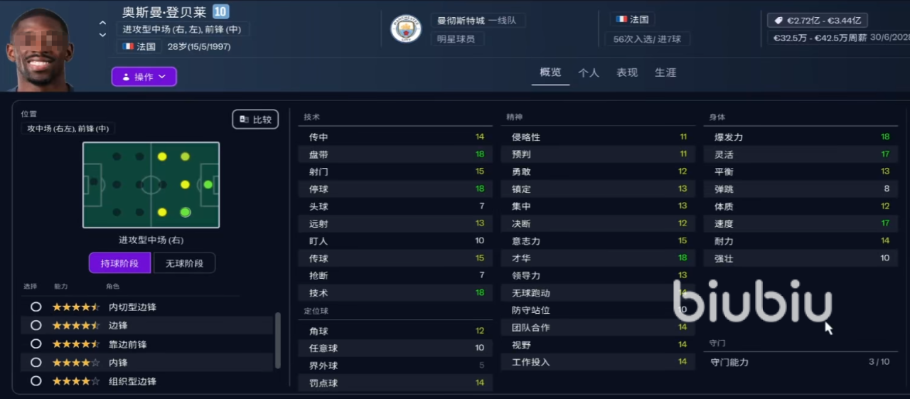 7、奥斯曼·登贝莱:明星球员,打边锋以及前锋位置,可达到四星以上,在技术领域,盘带,停球还有技术力数值都有18点,精神方面才华高达18点,身体素质爆发力也有18点,速度跟灵活度有17点,体能完美,不管是左脚还是右脚精准度都极高。