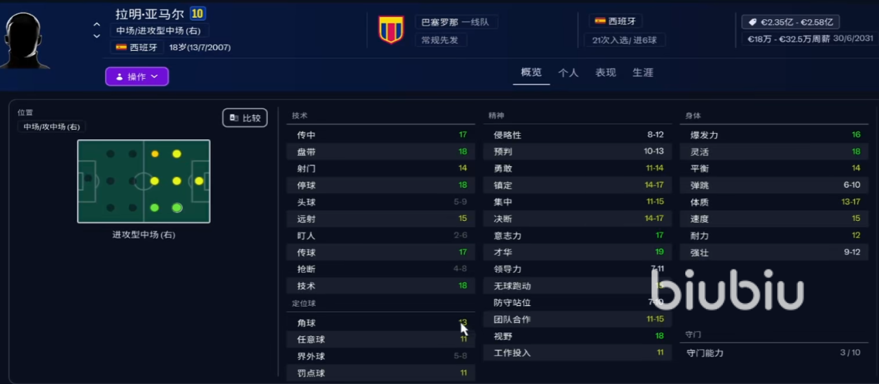 5、拉明·亚马尔:左脚较为精准,技术力也不错,传中以及传球能力都能打到17点,而盘带,停球还有技术数值都有18点,精神方面有强大的意志力,高达17点,才华达到了19,另外视野为18,对球场观察也会较为仔细。而这名球员年仅18岁,未来可期。