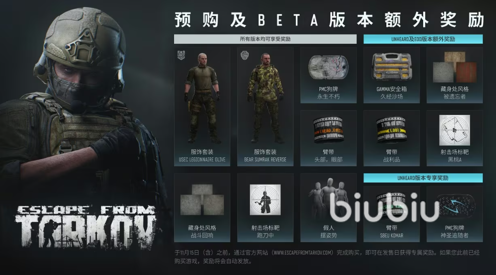 此外,持有顶级黑边版本的玩家,未来还将获得特殊的PMC狗牌、独特臂章以及角色定制内容,具体信息有待后续公布。要想获得上述全部预购奖励,必须要在2025年11月15日(含)之前,通过《逃离塔科夫》的官方网站完成游戏预购或已经拥有游戏。如果是早就购买的,那么这些奖励将在发售日自动发放到游戏账户中。