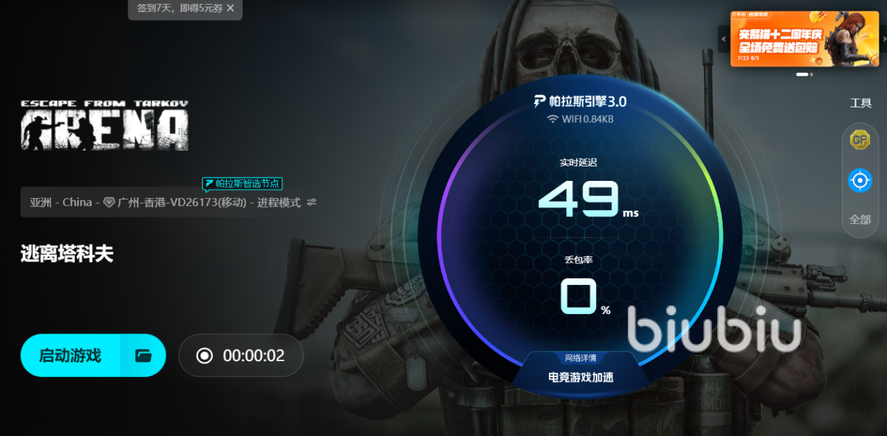 对于担心操作复杂的用户而言,biubiu加速器提供了极为简便的使用流程。安装完成后,只需在主界面选择《逃离塔科夫》,点击启动即可完成全部网络设置。系统将自动识别当前网络类型,并分配最佳加速线路,同时通过直观的可视化面板展示延迟变化与连接质量,让用户清晰掌握每一次优化效果。更值得一提的是,biubiu现面向新用户提供24小时免费试用机会,所有用户在应用内输入指定口令【biubiu不卡顿】,还可额外领取72小时免费加速时长,真正实现零成本体验专业级网络优化服务。