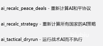 还有重新计算的指令,用【ai_recalc_peace_deals】是重新计算和平协议,而【ai_recalc_strategy】是重算国家策略,使用【ai_tactical_dryrun】是只运行战术但是并不执行,预览结果用的。