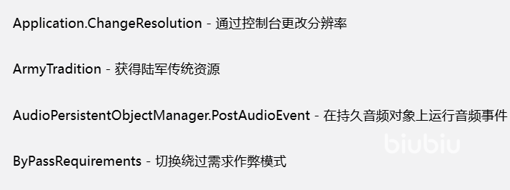 想要更改分辨率,可输入【Application.ChangeResolution】,打算获取陆军传统资源,使用【ArmyTradition】就可以了。