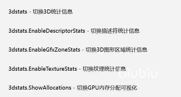 切换3D统计信息是最基础的选项,输入3dstats,然后一定要加上.号,之后后缀为EnableDescriptorStats,是切换描述统计信息,后缀输入EnableTextureStats则是切换纹理统计信息,玩家们可按需调控。
