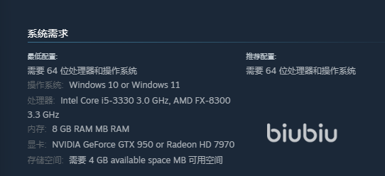 相关的配置要求,大家可参考下图,其实玩游戏只要达到了该部作品的最低配置需求,那么就可以正常体验这部作品了,如果担心有卡顿,闪退等现象的话,搭配一款提速应用基本上就可以解决。如果大家的配置比图中所推荐最低配置高的话,那么大家就更无需担心体验这部作品的时候会有设备问题,直接处理好网络问题即可。