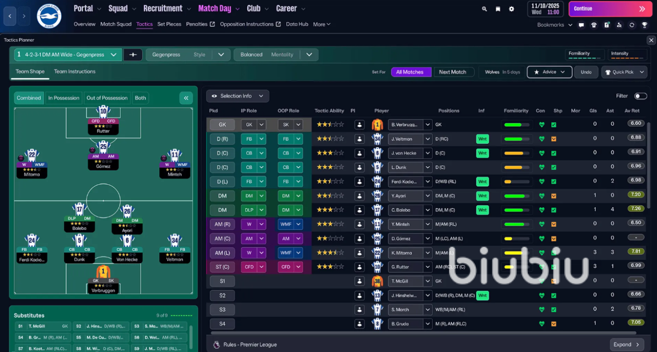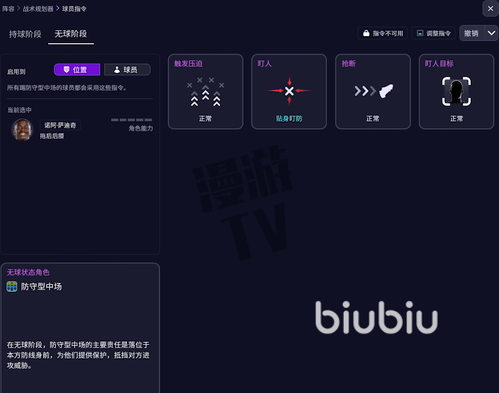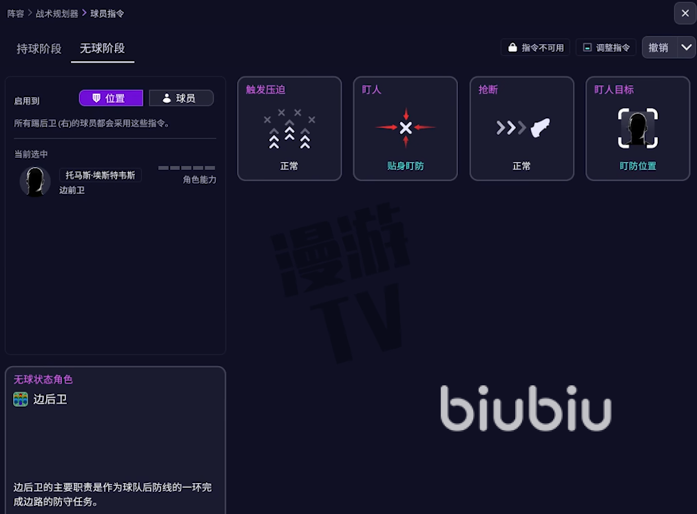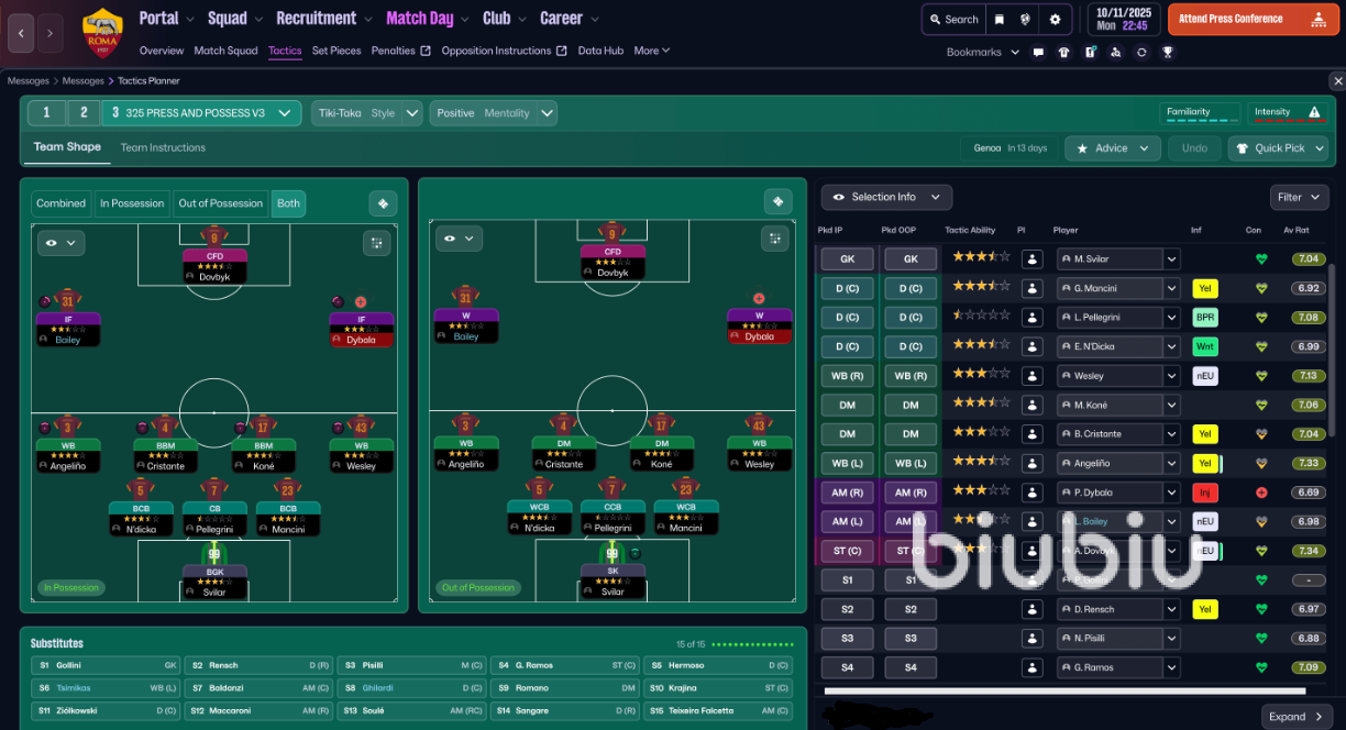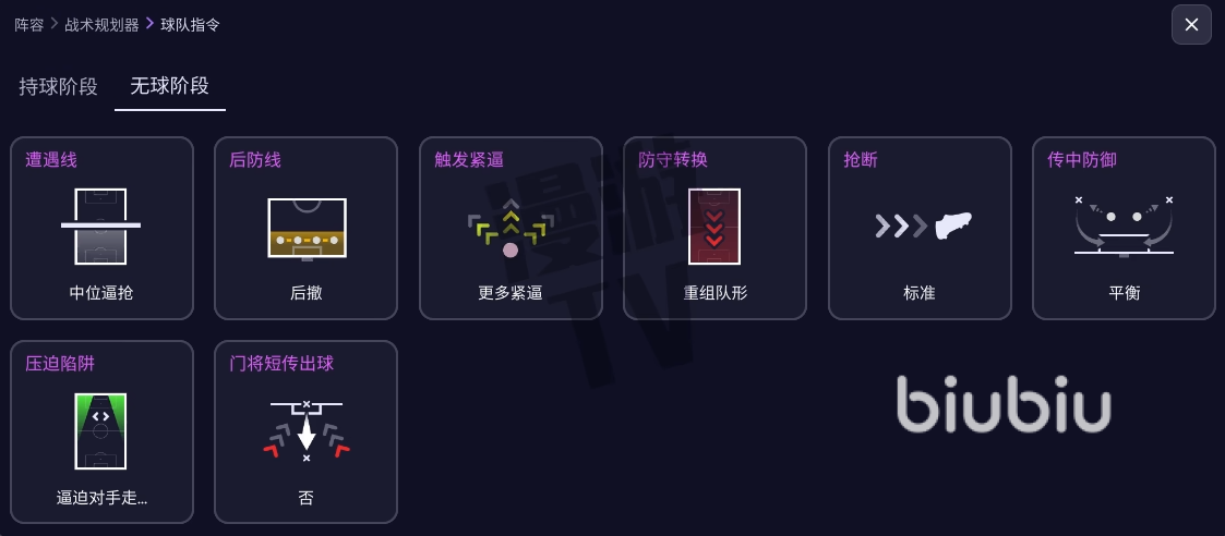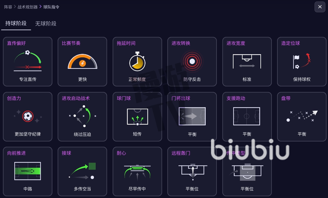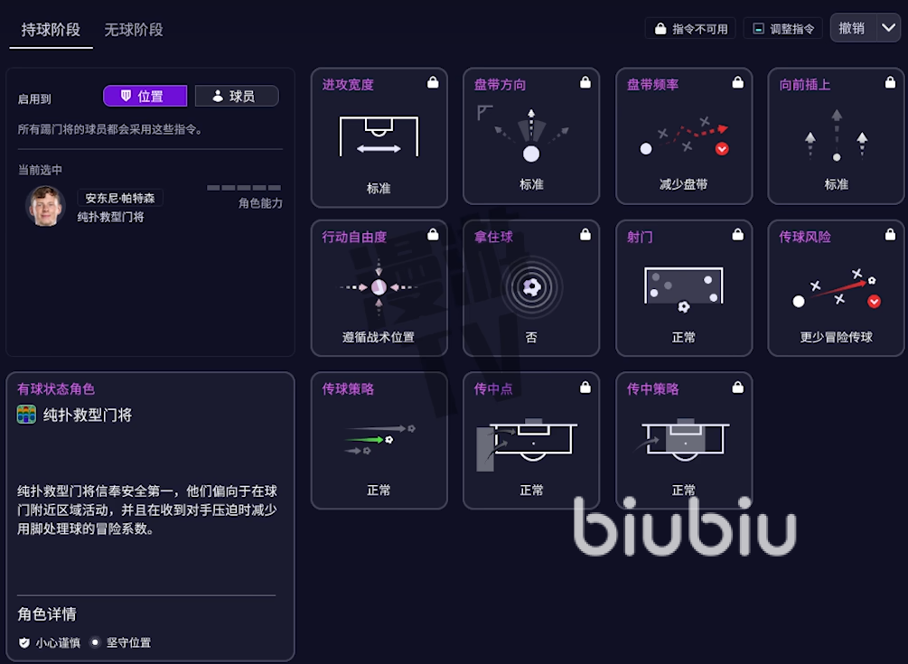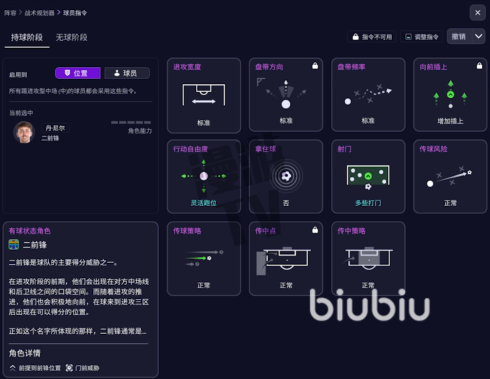 另外就是FM26引入了战术可视化工具,让你能清晰地预见战术在场上的实际效果。该工具将球场划分为三个垂直区域和九宫格。你可以点击任何格子,实时预览球队在不同区域持球或无球时,阵型如何动态变化。并全面重做了球员角色系统,持球阶段增了"组织型边后卫"、"边中前卫"等角色,更精准地定义球员在进攻中的职责。无球阶段首次引入了独立的无球防守角色,这些角色将决定你的球员是倾向于高位逼抢还是专注低位防守。