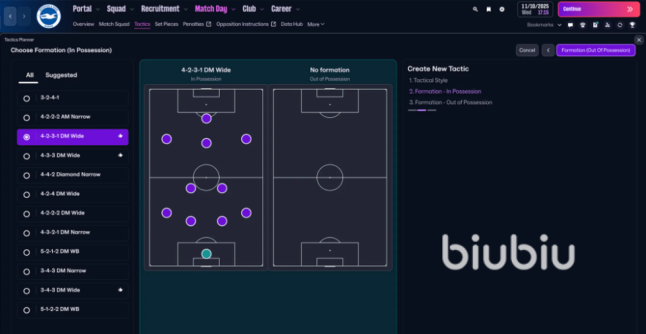 核心机制是新增了独立的阵型系统,这也是FM26最具革命性的变化。允许你为球队设置两种独立的阵型:一种用于持球进攻,另一种用于无球防守。在创建战术时,你首先需要选择球队持球时的基础进攻阵型,系统随后会智能推荐与之配套的无球防守阵型以供选择。例如,选择4-3-3作为持球阵型后,游戏可能会推荐4-1-4-1作为无球阵型,以实现更顺畅的攻防转换。