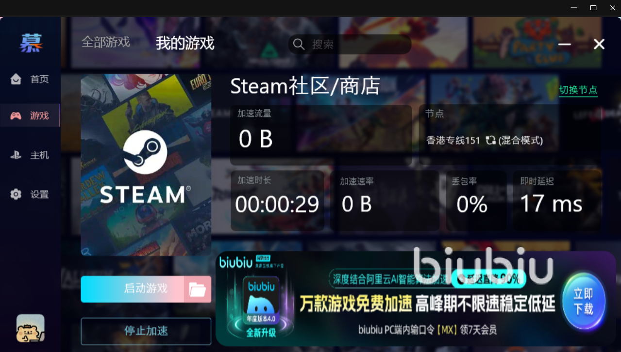 端内置海量游戏库,支持当前主流的各大PC、主机、手游等平台,无论是炙手可热的《英雄联盟》、《Valorant》、《Apex英雄》主流竞技游戏,还是海外大作/各类Steam精品独立游戏,Biubiu都提供了深度优化支持,亚服、美服、国际服等节点随意切换。