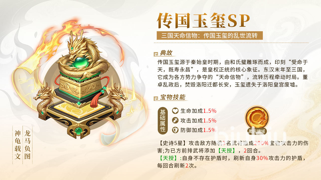 传国玉玺则是权力与正统性的象征,承载着丰富的历史背景与情感价值。起源于秦始皇时期,由和氏璧雕琢而成,被视为皇权合法性的信物。进入三国乱世后,成为群雄争夺的核心目标,寓意“天命归属”。在游戏中,该宝物为武将提供全面的基础属性提升,并附带乾元镜域技能:对三名随机敌方武将造成200%宝物攻击力的伤害,同时为己方前排单位生成护盾,护盾每回合刷新两次,具备攻防兼备的特点。