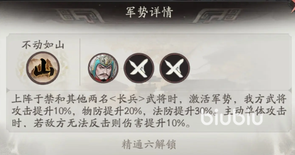 于禁的核心天赋为“不动如山”,在成功参与合击后可触发追加伤害效果。即便首次攻击造成的数值较低,后续追击所带来的叠加伤害足以快速削减敌方血量。只要目标处于攻击范围内并被合击命中,即可激活该天赋效果。另一关键天赋“从攻别征”触发条件宽松且频率高,每次触发均可带来额外打击机会,使其在持续追击过程中展现出强大的战场压制能力。