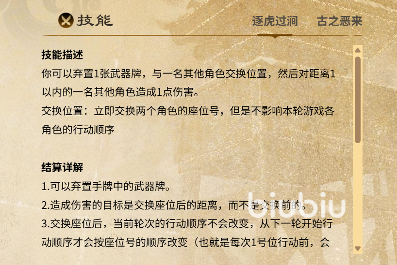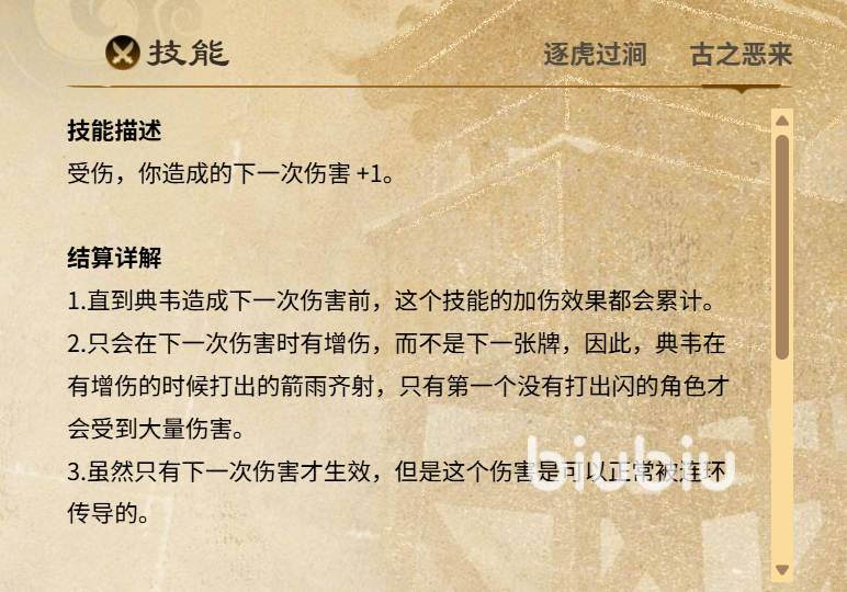 第二个技能【逐虎过涧】则展现了典韦出色的机动与控制能力。使用时,玩家可弃置一张武器牌,与任意一名其他角色交换位置,并对距离为1的目标造成1点伤害。该技能融合了“位移”与“即时输出”双重效果:既能调整战场站位,规避集火或切入后排;又可在换位瞬间打出伤害,实现突袭效果。由于位置交换仅影响下一轮行动顺序,不影响当前回合流程,因此可用于实施“先手保护”、“快速切后”等多种战术布局。
