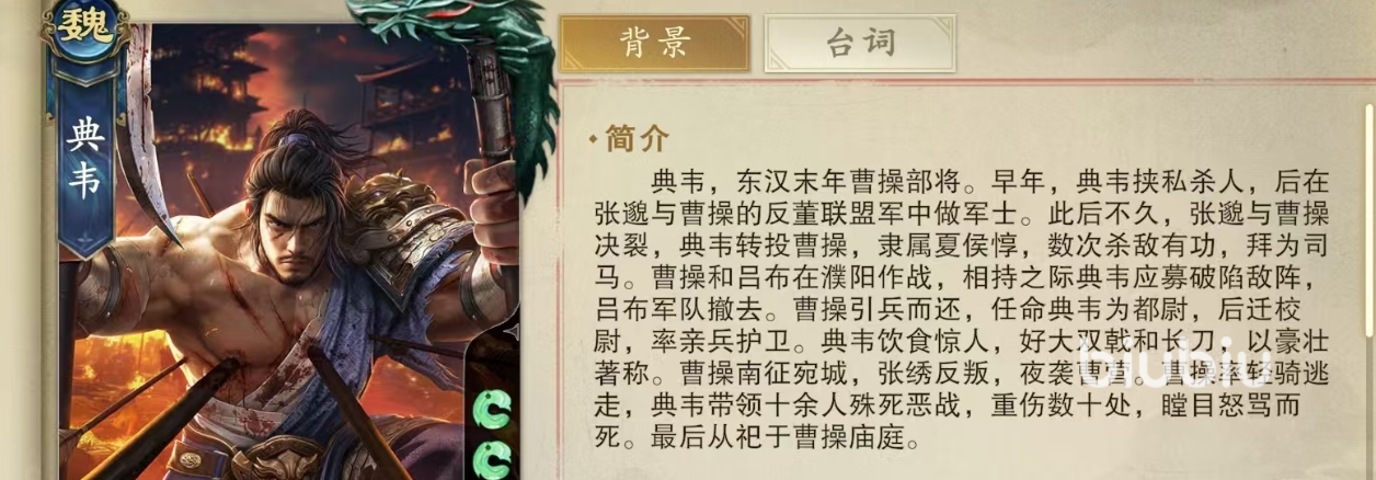 总体而言,典韦在《名将杀》中是一位攻守均衡、适应性广的前排核心武将。凭借【古之恶来】实现持续增伤爆发,依靠【逐虎过涧】灵活调整战场位置,不仅自身输出稳定,还能为团队创造有利局势。无论是在入门阶段还是高端对局中,他都是魏国阵容中不可忽视的顶级战力。