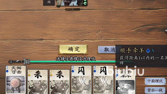 由于项羽具备较强的反制能力,面对“顺手牵羊”时极大概率会打出“无懈可击”来抵消效果。一旦确认其使用该牌,立刻衔接释放“十面埋伏”,此时因项羽已无可用的“无懈可击”,技能无法被抵消,强制触发其弃掉所有“闪”牌。