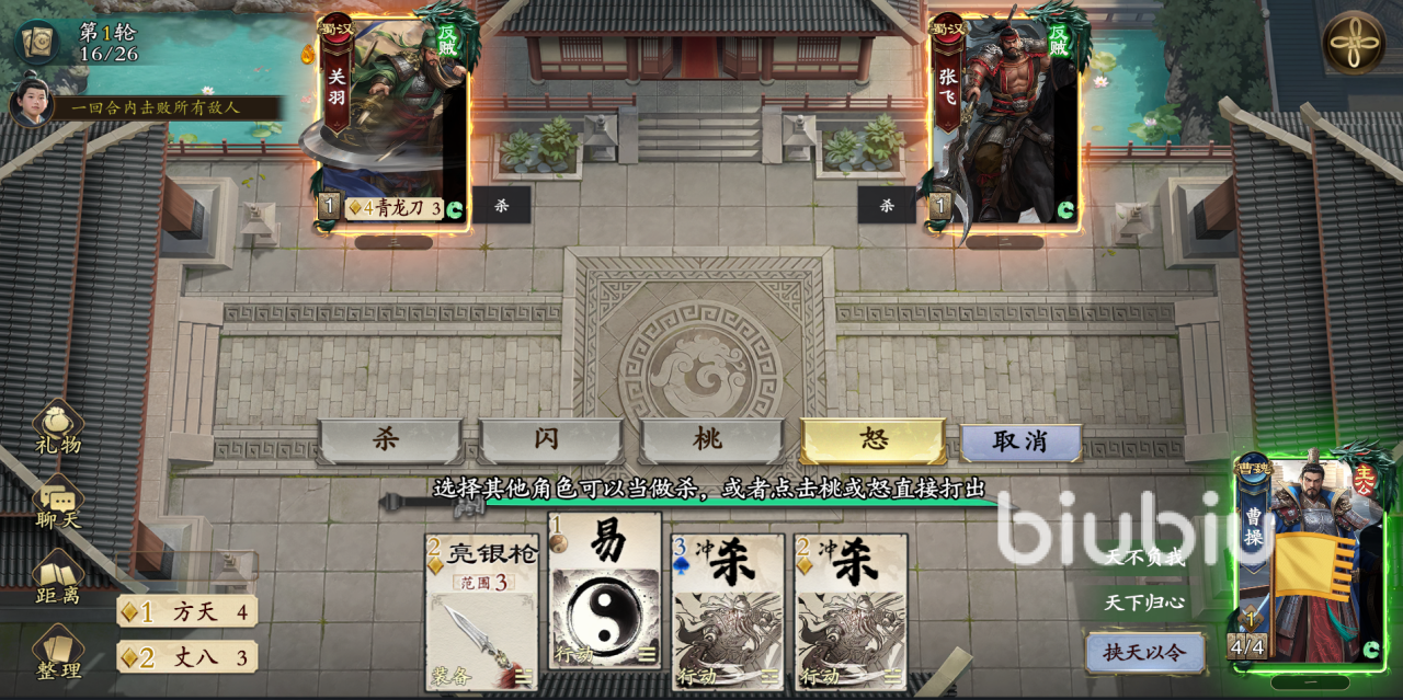 第26关的核心机制在于巧妙利用“掉血”来触发特殊效果。面对曹操时,玩家需主动使用阵前对决并放弃防御,使自身进入受伤状态,以此激活胡笳十八拍的技能效果。该效果可强制弃除曹操手中的桃类回复卡牌,削弱其持续作战能力。随后在其出杀阶段进行反制,即可顺利取胜。此关卡强调“舍弃即获取”的战术思维,精准把握技能触发时机是通关前提。