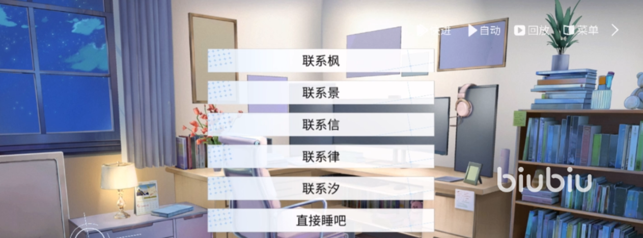 当完成首个完整循环后,主角将回到自己的房间,并面临六个可选操作。这六个选项直接决定了接下来的剧情发展方向,建议在此处手动保存存档,以便后续回溯。每个选项对应一种结局类型,若希望进入某位角色的专属故事线,应选择与其相关的联络方式。此外,“直接睡觉”也可能触发特定个人剧情,需根据目标角色进行策略性选择。以下以“景”的路线为例说明后续操作要点。