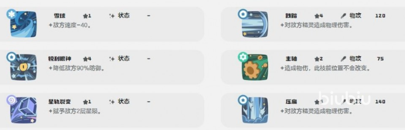 “咆哮”可使敌方物理攻击力下降80%,在对抗高物攻精灵时具有极强的压制作用。“主轴”则降低敌方90%的防御力,配合队友的高爆发技能,能迅速击破防线,实现高效集火。“防御”技能可在关键时刻减少80%所受伤害,大幅提高生存概率,是关键保命手段之一。“杠杆置换”为核心功能技,使用后立即获得3点能量,并触发技能位移带来的能耗减免效果,进一步强化技能连贯性与释放频率。