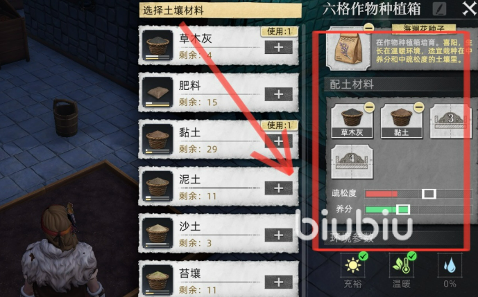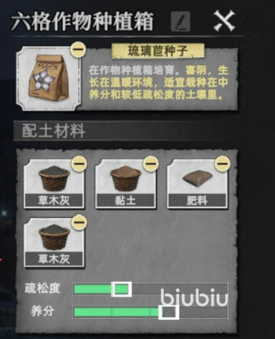 关于草木灰与土壤的搭配,并没有统一的标准配方,需根据具体作物的需求灵活调整。以「琉璃苣」为例,该作物对土壤疏松度较为敏感,加入草木灰后容易导致疏松度过高,此时可添加黏土进行调节。由于黏土本身疏松度较低,只需加入一份即可有效降低整体疏松水平。若发现养分不足,再配合使用肥料补充,便能实现理想的种植环境。