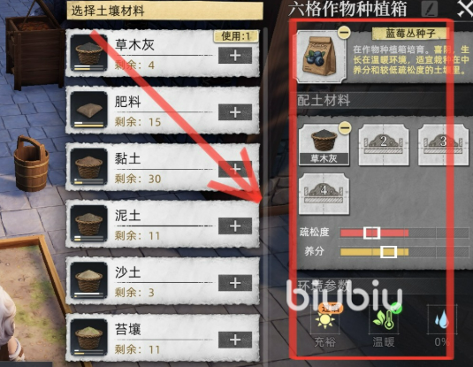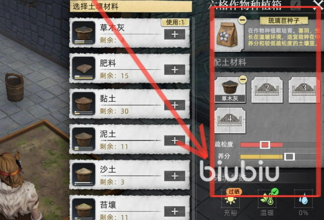 种植「琉璃苣」时,若仅添加一份草木灰会导致疏松度过高而营养不足,此时推荐使用泥土进行调节。泥土具备较为均衡的疏松度与养分含量,加入后可有效缓解失衡问题。相比之下,若使用黏土则可能使疏松度降得过低,进而影响其他属性。为弥补养分缺口,可在后期加入两袋肥料,确保各项进度条均达到理想区间。