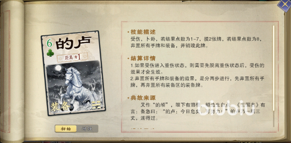 的卢的核心机制在于受伤后触发卜卦判定:若点数为1至7,则可抽取两张手牌;若结果为8,则需弃置全部手牌与装备,且坐骑自身会被销毁。这种极端化的设定决定了它不适合保守打法,但在逆风局中却可能成为翻盘的关键。使用时应避免在状态良好时贸然装备,最佳时机是在手牌耗尽或生命值较低的情况下主动触发效果,以最大化收益并控制损失。
