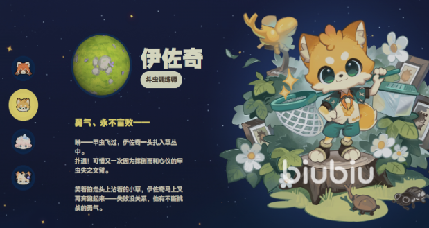 伊佐奇是一位充满活力的角色,原型是一只浅黄色的狐狸,身穿绿色运动服,手持捕虫网,行动敏捷。他的职业设定为斗虫训练师,性格坚韧不服输,擅长在野外环境中进行探索。无论是搜寻稀有昆虫,还是深入未知区域探险,伊佐奇都能带来意想不到的收获,是冒险旅程中不可或缺的伙伴。