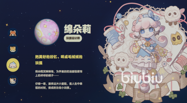 棉朵莉是一位温柔细腻的角色,原型为一只小羊,说话轻柔,举止文静。她热衷于手工制作,尤其喜欢把生活中的美好片段通过玩偶的形式记录下来。比如品尝到美味的奶油蛋糕后,她会缝制一个蛋糕造型的布偶;看到夕阳下的花朵,便会创作出捧花的小兔子手工艺品。在游戏中,玩家可以通过她定制独特的装饰摆件,增添个性化元素。