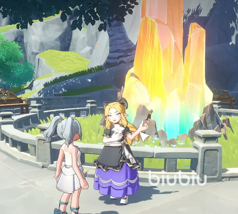 该玩法对应的任务名为精灵寻宝,想要参与需前往采邑地。在地图中央区域,有一块醒目的大型彩色矿石,附近会有一位金色头发的女性NPC驻守。与她对话即可接取精灵寻宝任务,正式开启寻宝之旅。