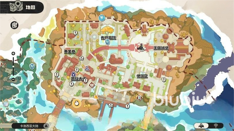 这些小游戏分布在各个城市区域,位置较为分散,其中在王国城堡的凯旋大道周边就有多个可互动点,地图上以宝箱图标进行标识。主要玩法之一是碎片收集任务,玩家需先前往指定地点接取任务,随后根据提示在附近区域寻找足够数量的碎片,完成收集后即可成功提交任务并获取对应奖励。