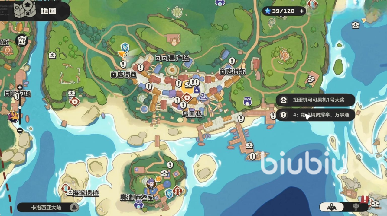 在可可果广场附近也设有多个小游戏任务点,例如为小精灵撑伞的任务,只需与NPC对话并按照要求操作即可完成,达成条件后便可领取成就奖励。此外还有场景互动类任务,需要携带特定精灵参与,比如击打鼓类小游戏,在完成后可开启宝箱获得道具奖励。