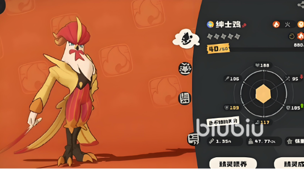绅士鸡的基础属性表现优异,远超同等级精灵。初始攻击力达到106点,生命值为188点,初获时便具备较强的作战能力。一旦完成超进化,属性将迎来大幅跃升,其中攻击力可飙升至380点,显著增强其在高强度战斗中的生存与输出能力。