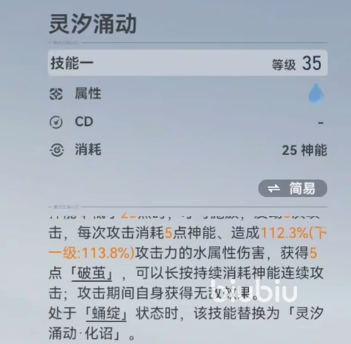 一技能名为“灵汐涌动”,需消耗25点以上神能方可释放。释放后将发动五次连续攻击,每次攻击消耗5点神能,并造成不低于110%攻击力的水属性伤害。值得注意的是,在该技能发动期间,海拉处于无敌状态,具备一定的生存与打断能力。