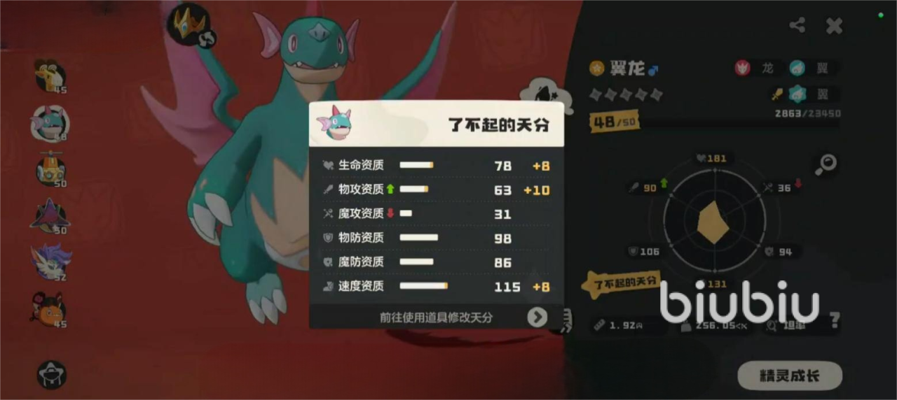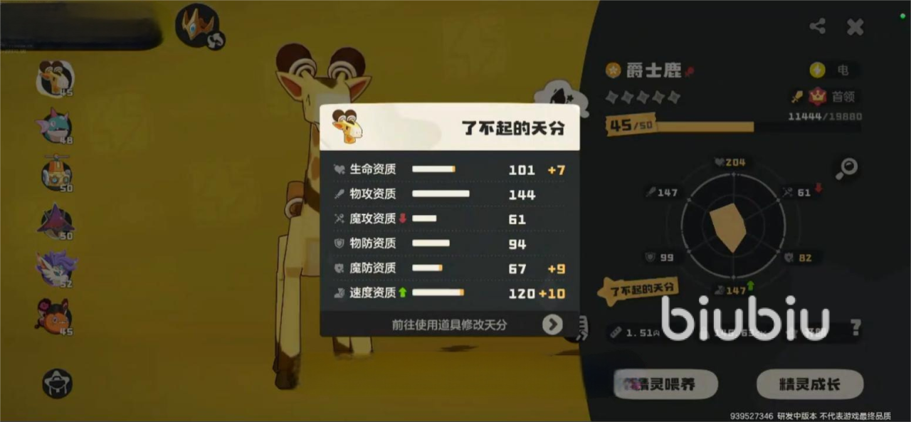 爵士鹿是理想的副输出选择,拥有120的速度基础值和高达144的物攻面板,属于顶尖物理打击手。若通过首领血脉完成超进化,其输出将进一步强化。其被动“蓄电池”可在每次登场时永久提升20%物攻,经过多次轮换上场后,伤害累积极为可观。建议搭配开朗性格,额外获得10%速度加成,确保行动优先权。