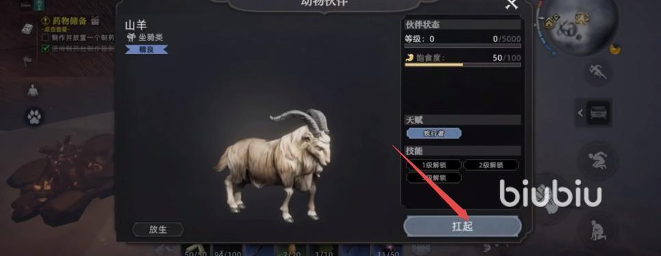 山羊是一种非常适合前期驯化的伙伴。玩家只需布置一个简单的捕兽陷阱,等待山羊进入范围后便可自动捕获。若在捕捉过程中造成较重伤势,建议及时治疗或直接搬运回营地进行圈养。经过一段时间的喂养后,山羊便可成功驯服。它具备冲撞树木的能力,能高效协助玩家获取木材资源,在游戏初期极大地提升了资源积累效率。