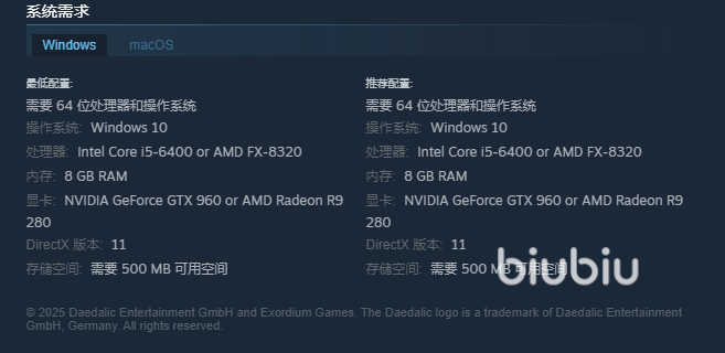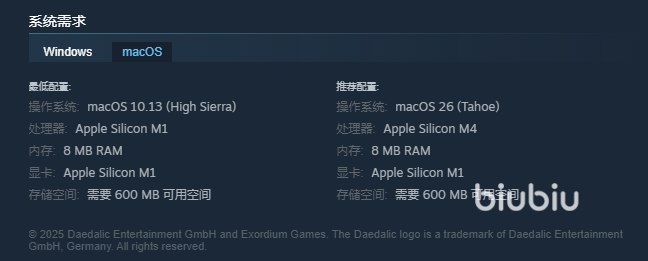 其次是mac系统的小伙伴,建议预留600mb的空间,显卡M1,运行内存8mb。其他条件可从下图当中详细查看,只要达到最低配置要求就可以顺利体验该作品。