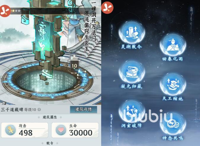 作为宗门体系中的枢纽性建筑,三千道藏碑直接影响其他所有建筑的等级上限,所有宗门设施的升级均不可超过其当前等级。因此,优先提升该建筑是每位玩家的首要任务。此建筑具备六项独特功能:其一为灵潮敕令,激活后可在12分钟内使弟子工作效率翻倍,同时宗门资源产出提升100%。